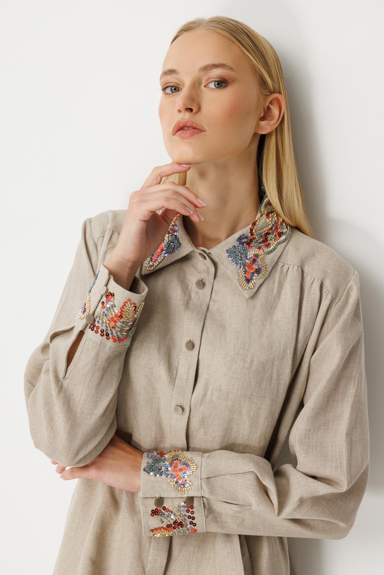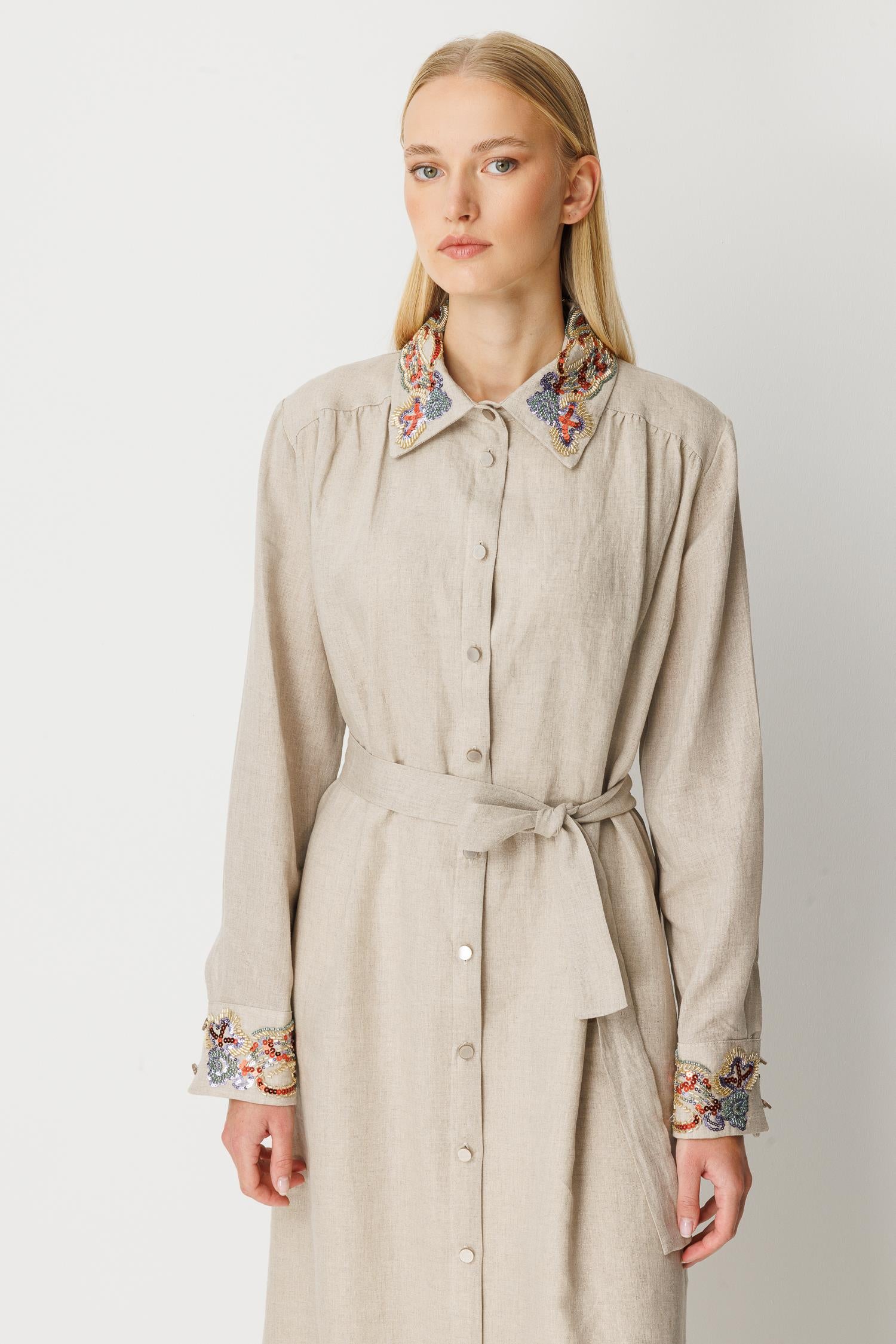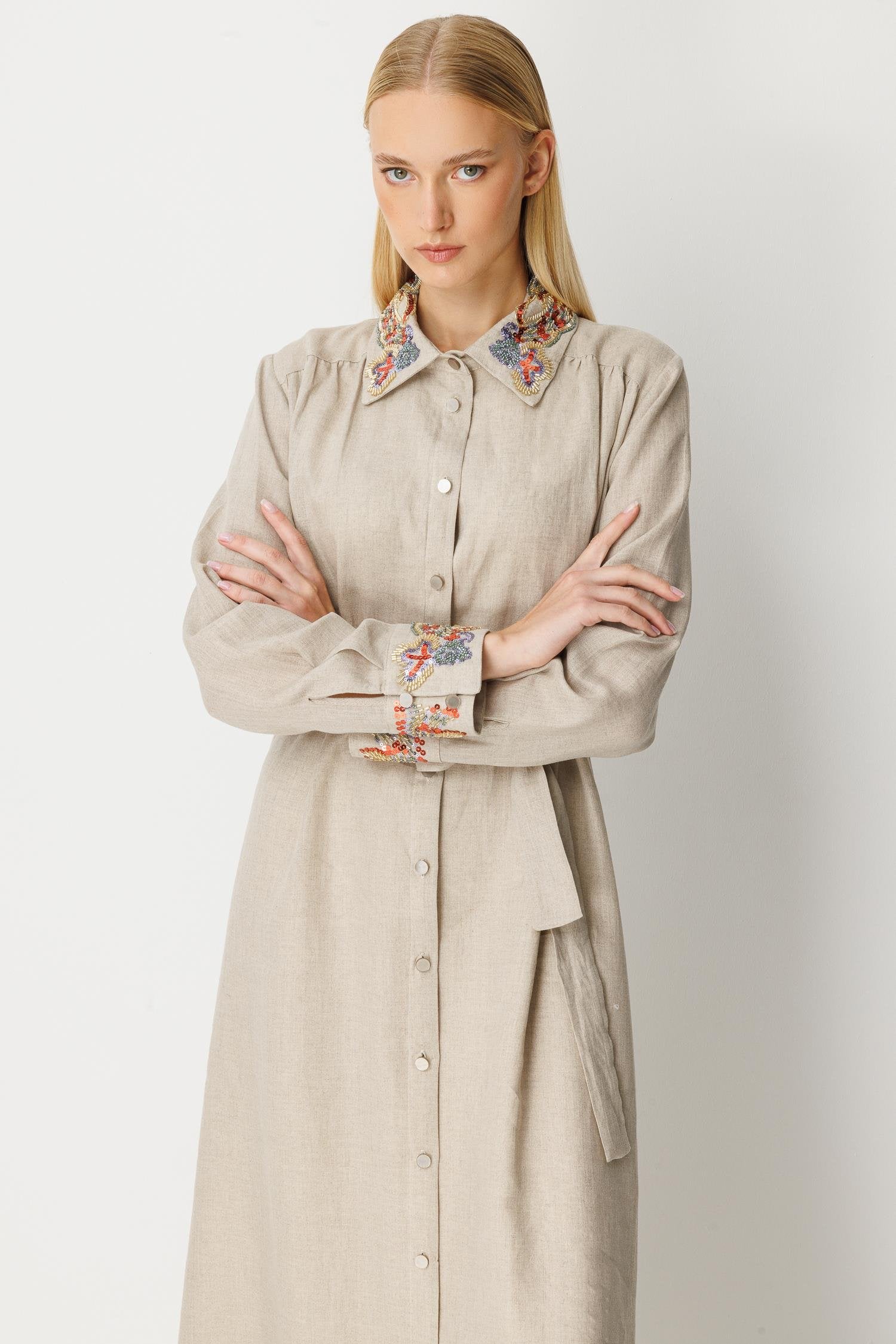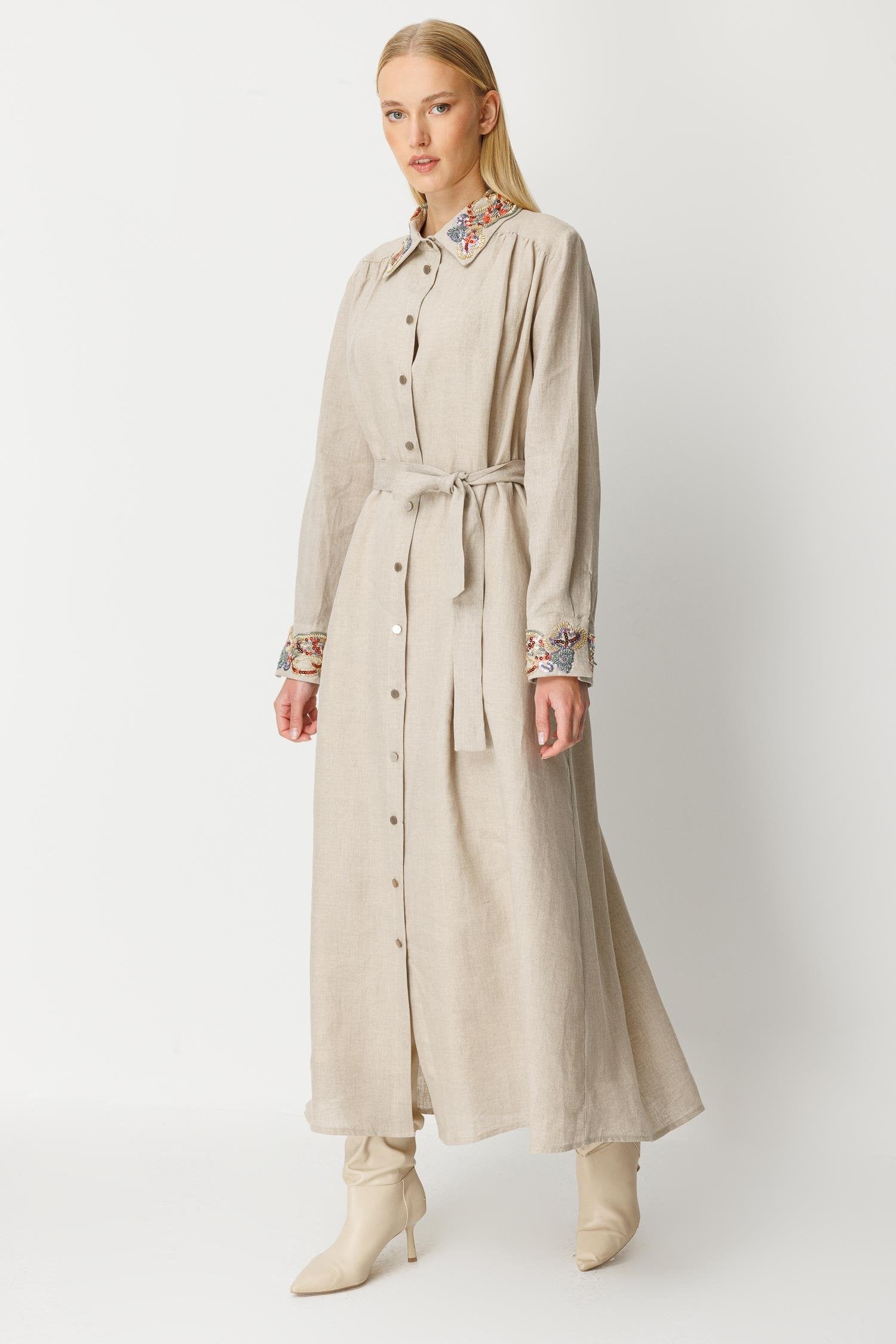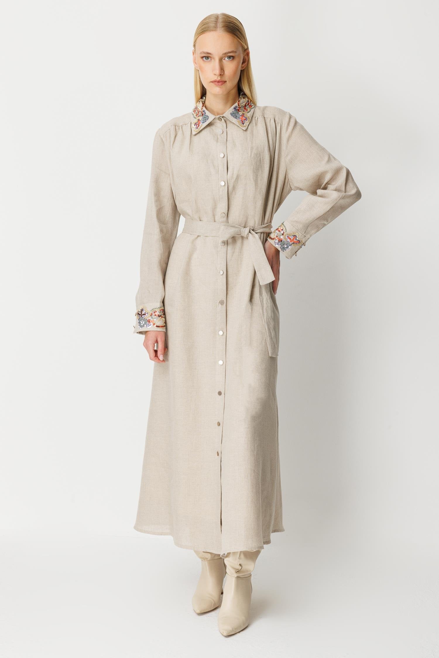 Ghisa Linen Embroidered Dress Stone
